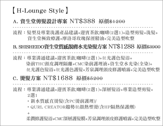 | H-Lounge Style-美髮專案-使用純日系資生堂產品加上獨樹一格的髮型設計,讓您擁有時尚造型與健康髮質,獻給自己一場前衛的美髮之旅!只要388元起即可享受【H-Lounge Style】原價最 售價:388 我要購買 |